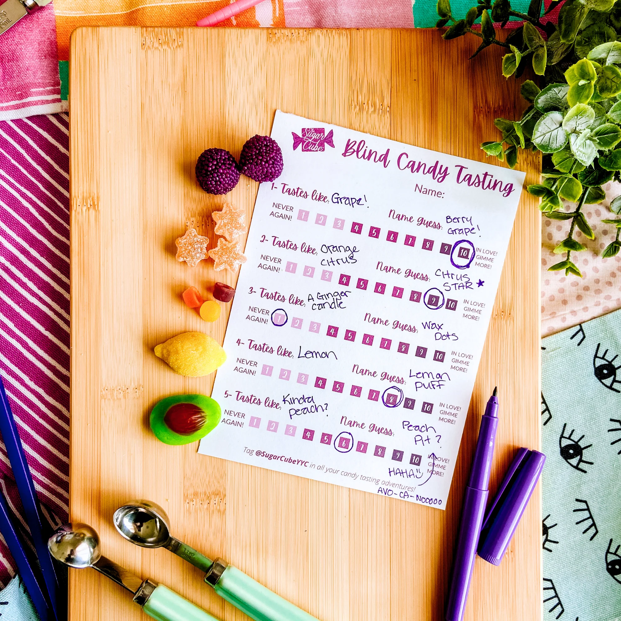 - Blind Candy Tasting Answer Sheet- sealed in an envelope until after the tasting so no cheating. This will reveal the flavours, names, and any fun facts we might have about each candy!