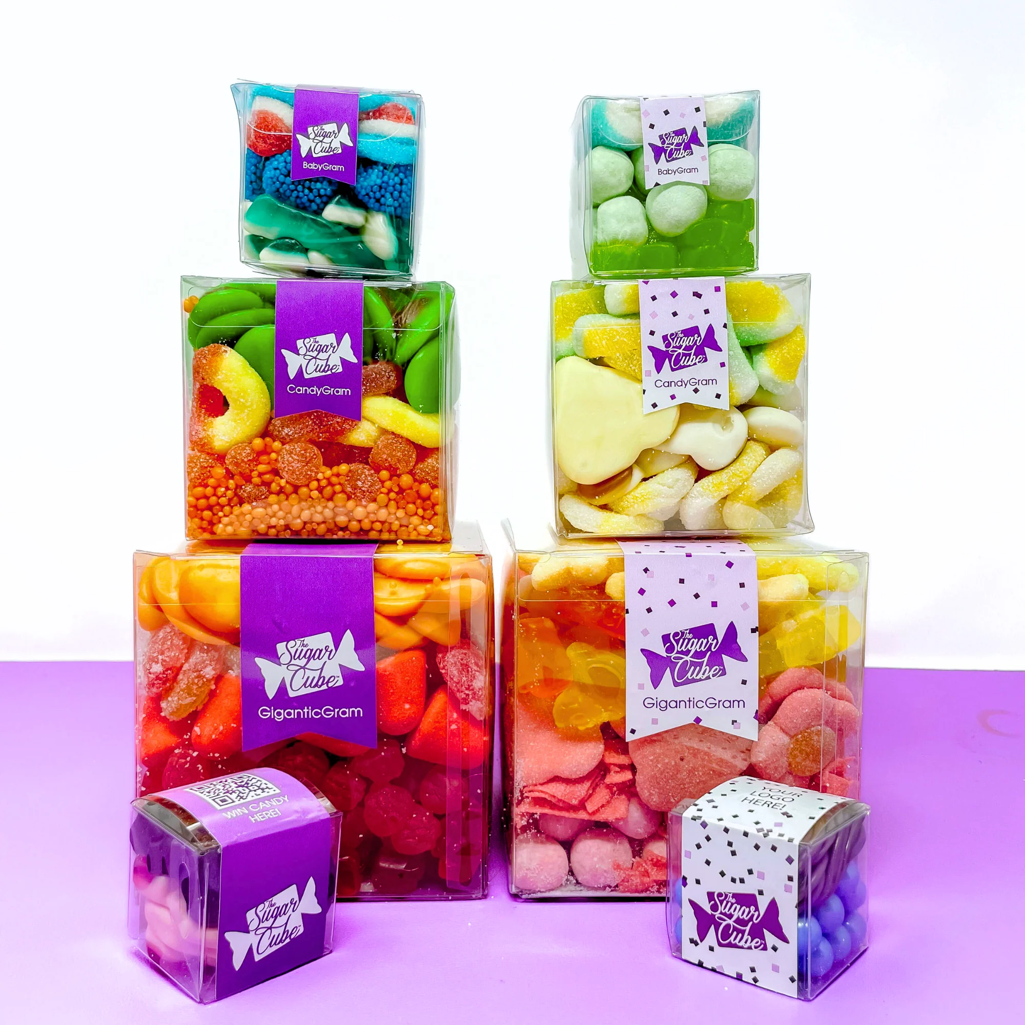 This gift-ready tower contains one of each of our CandyGrams—Baby, Regular, and Gigantic—stacked, heat-sealed, and tied with a bow. Filled with approximately 1.5 kg of candy in a mix of sweet and sour varieties, it's a standout gift for birthdays, team surprises, or any moment worth celebrating big.